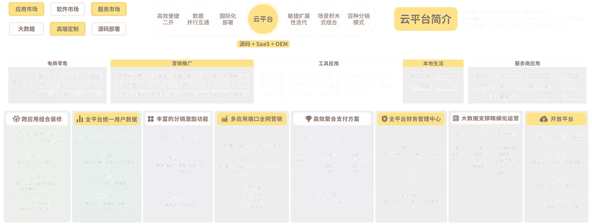 云平台,致力于打造一个为移动互联网从业者提供全链路软件+服务的供应链平台,为实体赋能,加速商业体线上线下场景融合!